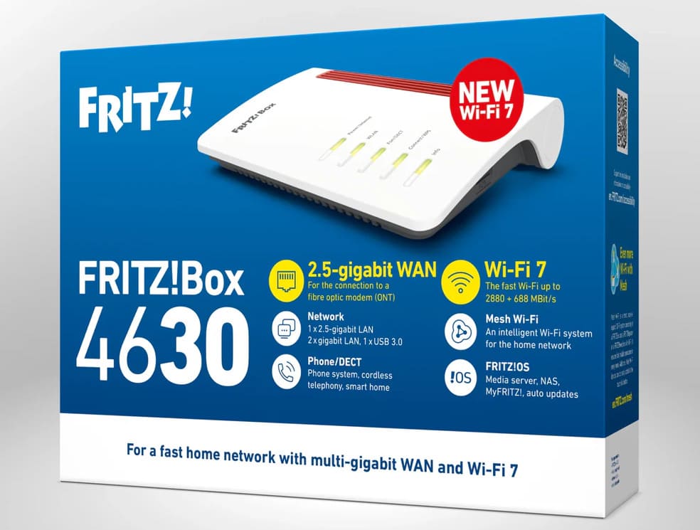 Grazie al Wi-Fi 7, il nuovo FRITZ!Box 4630 garantisce una connessione Wi-Fi veloce e stabile nella rete domestica. Il nuovo modello entry-level offre agli utenti con modem in fibra ottica velocità internet ad alte prestazioni fino a 2,5 Gbit/s tramite la porta WAN.