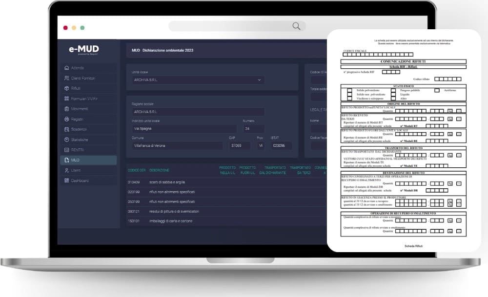 Digitalizzazione Completa: e-MUD registra i movimenti di carico e scarico, emette formulari e compila automaticamente il Modello Unico di Dichiarazione ambientale (MUD).
