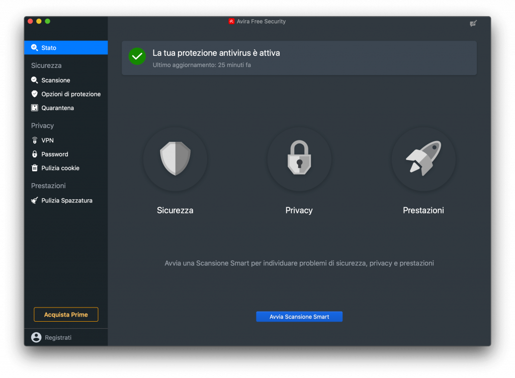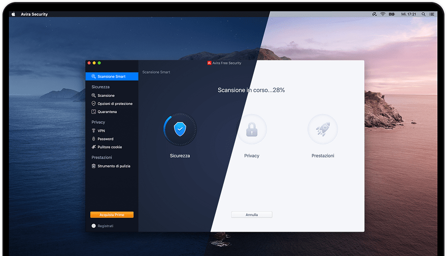 Sia agli utenti della versione Free che a coloro che hanno scelto le funzionalità complete di Prime, Avira Security per Mac offre una gamma di funzioni per la sicurezza, la privacy online e l’ottimizzazione delle prestazioni gestibili da un’unica interfaccia e alimentate dalla Scansione Smart attivabile con un solo clic. Questa funzionalità rileva e blocca i virus, elimina i cookie indesiderati e i file spazzatura che rallentano il sistema, e segnala qualsiasi altro problema relativo al dispositivo. Altre funzionalità di Avira Security per Mac riguardano la sicurezza, la privacy e le prestazioni.