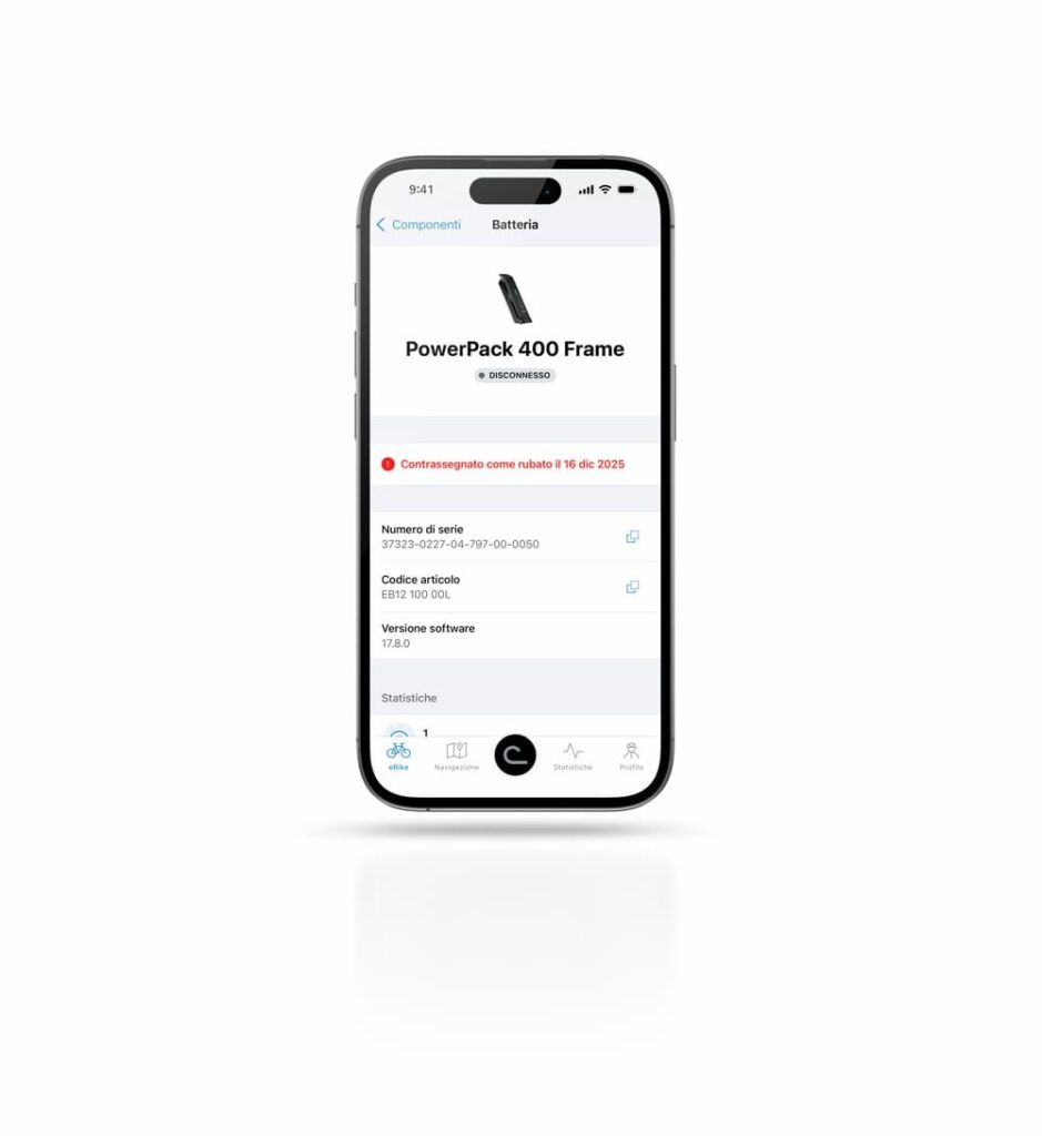 Grazie al principio di assegnazione digitale del sistema intelligente, tutti i componenti di un’eBike – motore, batteria, display – sono registrati in modo univoco nel sistema e associati a un profilo utente specifico. Se l’utente contrassegna la propria eBike o batteria come rubata, questa informazione viene memorizzata in modo centralizzato e può essere consultata ovunque nell’ecosistema digitale di Bosch eBike Systems. Le app eBike Flow, DiagnosticTool e Bosch eBike Support accedono agli stessi dati. La segnalazione digitale può essere rimossa esclusivamente attraverso il profilo dell’utente registrato.