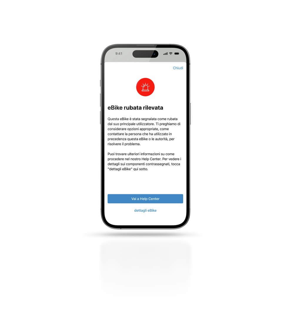 Se un’eBike o una batteria viene contrassegnata come rubata, è visibile nell’intero ecosistema digitale di Bosch eBike Systems. Questo rende la rivendita molto più difficile e aumenta le possibilità di riavere la propria eBike: gli acquirenti dell’usato, i rivenditori specializzati e le autorità ricevono un avviso quando tentano di connettersi all’eBike tramite l’app eBike Flow, grazie ai numeri di serie dei componenti contrassegnati come rubati. Inoltre, la connessione con l’app eBike Flow viene bloccata in modo permanente: non è più possibile ricevere gli aggiornamenti over-the-air o selezionare le impostazioni personalizzate delle modalità di marcia. Anche i rivenditori specializzati ricevono un avviso nel software di diagnostica DiagnosticTool di Bosch eBike Systems quando collegano l’eBike per la manutenzione.