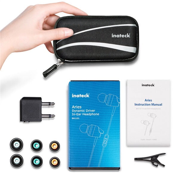 La confezione, in semplice cartone racchiuso da una fascia di blu, ha al suo interno un astuccio nero, cosi da poterle ritrarre al suo interno e garantire protezione durante gli spostamenti oltre al riparo dalla polvere. All’interno dell’astuccio troveremo una piccola reticella ove saranno presenti i vari gommini di varie dimensione, una pinzetta per fermare il filo degli auricolari su una qualsiasi maglietta ed anche un adattatore aereo 2x spine mono 3.5 mm a presa stereo 3.5 mm. Insomma provvisto di tutto punto!