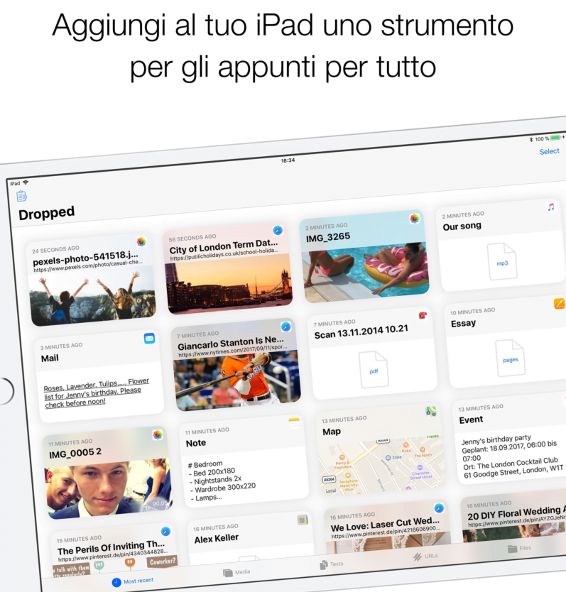 Dropped è un contenitore in cui verranno aggiunti vari tipi di file, possono essere inseriti sia copiando ed incollando dalla clipboard oppure direttamente trascinandoli nell’app stessa.