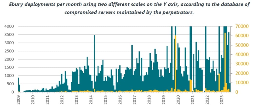 Alla fine del 2019 è stata compromessa l’infrastruttura di un grande e popolare registrar di domini e provider di web hosting con sede negli Stati Uniti. In totale, gli aggressori hanno violato circa 2.500 server fisici e 60.000 server virtuali. Gran parte di questi server, se non tutti, sono condivisi da più utenti per ospitare i siti web di oltre 1,5 milioni di account. In un altro incidente risalente al 2023, sono stati compromessi da Ebury circa 70.000 server dello stesso provider di hosting. Anche Kernel.org, che ospita il codice sorgente del kernel Linux, è annoverato tra le vittima di Ebury.