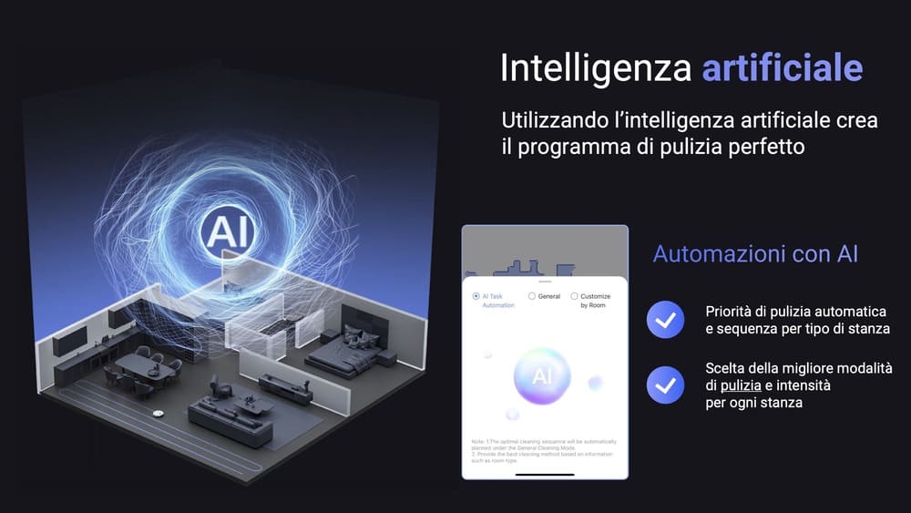 L’integrazione di tecnologie avanzate permette al robot di elaborare milioni di informazioni al secondo per anticipare esigenze, rilevando in tempo reale le macchie più ostinate e adattando dinamicamente la priorità, la sequenza, la modalità e l’intensità della pulizia in base alla tipologia di stanza.