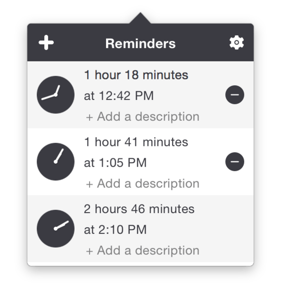 Gli sviluppatori hanno escogitato una soluzione pratica e veloce da usare per creare al volo i reminder: cliccando sull’icona dell’app in alto a destra nella barra dei menu del Mac, mentre l’utente trascina verso il basso il puntatore, un piccolo riquadro visualizza i minuti di posticipo del promemoria: basta rilasciare il pulsante del mouse non appena l’indicatore mostra i minuti desiderati per creare velocemente il reminder.