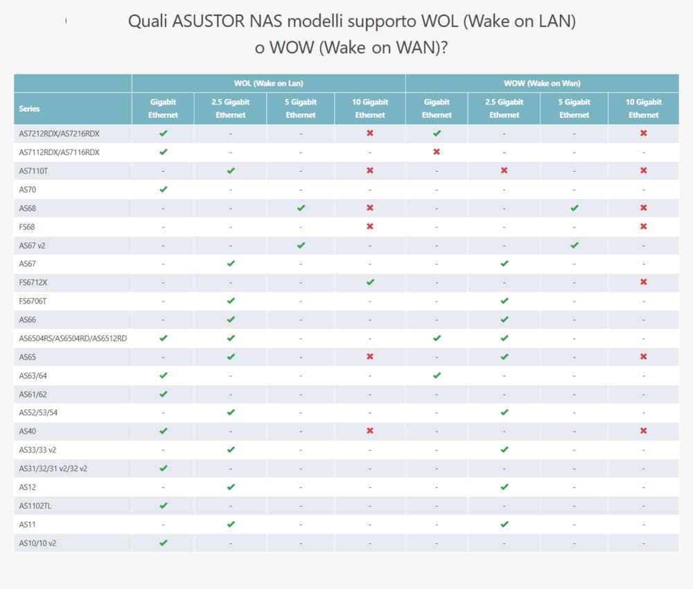 *Maggiori informazioni relativamente al supporto Wake On Wan per singole serie di NAS sono disponibili al seguente link: https://www.asustor.com/it/solution/wake_on_wan