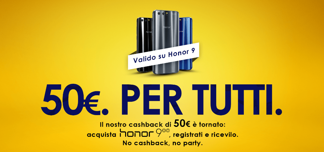 La meccanica è semplice: chi acquisterà un Honor 9 online e in negozio dal 2 al 31 ottobre, potrà richiedere il rimborso di 50€ iscrivendosi al sito www.honorpromo.it/honor9cashback dal 16 ottobre al 10 novembre.