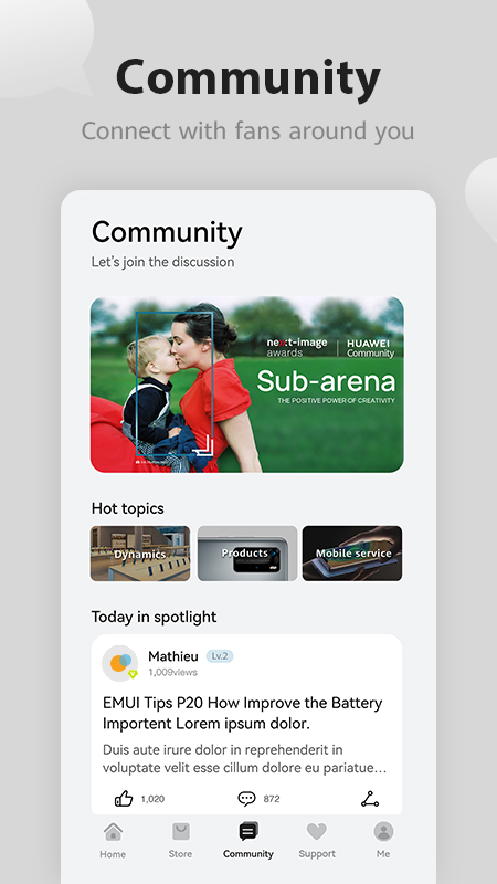 La nuova app all-in-one che aggrega tutti i servizi Huawei: Huawei Supporto, Huawei Community e Huawei Store.