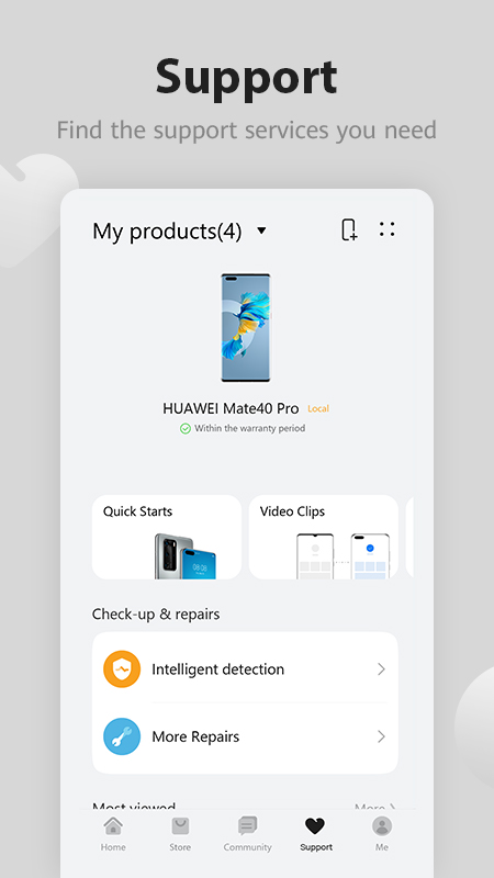 • Supporto: sezione dedicata ai servizi post-vendita di Huawei Store, tra cui informazioni sul dispositivo, diagnostica intelligente, risoluzione dei problemi, informazioni sull’assistenza, attività e vantaggi dell’assistenza;