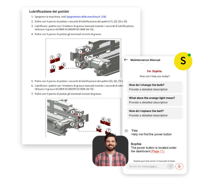 Sophia risponde in linguaggio naturale sfruttando i documenti aziendali caricati, offrendo risposte precise e collegamenti diretti ai contenuti tecnici rilevanti, il tutto senza necessità di configurazioni complesse ipertestuali che conducono direttamente alle sezioni rilevanti dei manuali tecnici.
