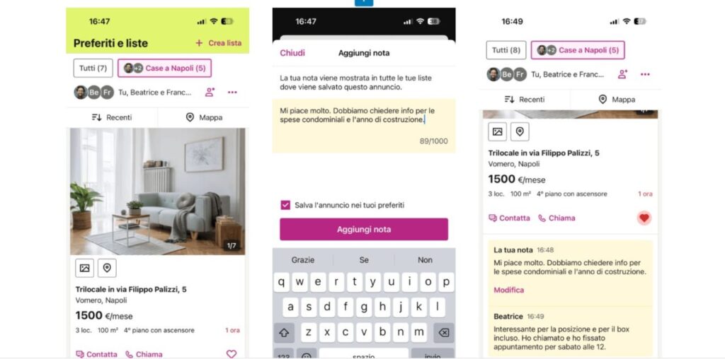 Inoltre, con la funzionalità “note” sarà possibile condividere commenti e aggiornamenti importanti sugli annunci (es. “Questo appartamento mi piace perché ha una terrazza”, oppure “Fissato appuntamento con agente per vederlo questo sabato”).