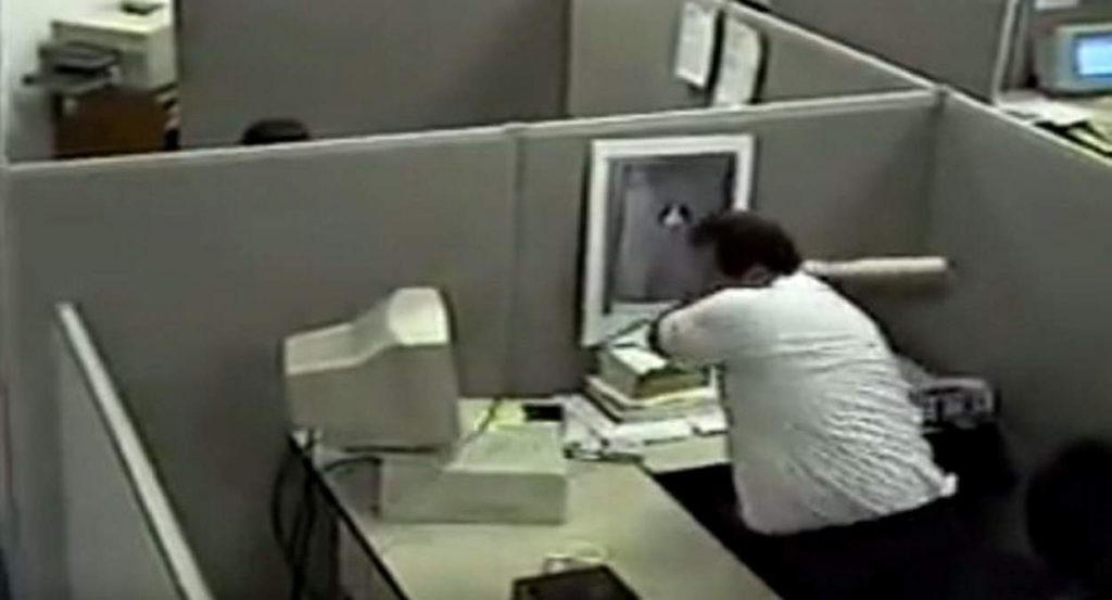 Qualcosa, però, sembra non funzionare e allora l’uomo colpisce con forza la tastiera, e poi decide di impugnarla e scagliarla contro il monitor. Nel frattempo, il vicino si affaccia dalla parete per verificare cosa stia accadendo, preoccupato per la sua incolumità.
