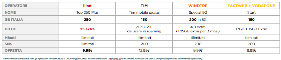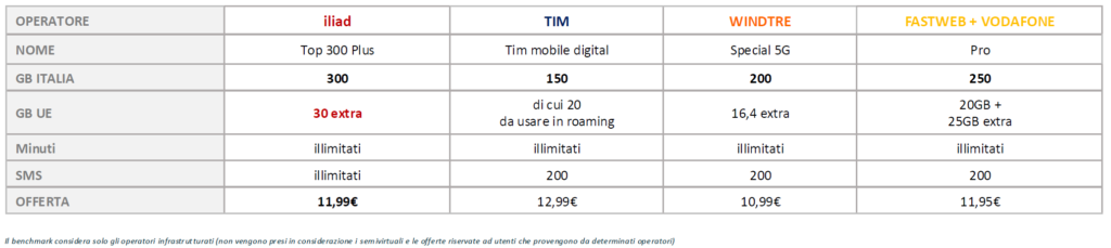 - TOP 300 PLUS2: con 300 GB di traffico dati per l’Italia, minuti e SMS illimitati su rete 4G/4G+ e 5G al prezzo di 11,99 € al mese. Per l’Europa sonodisponibili 30 GB extra dedicati al roaming. Tra le offerte general market degli operatori infrastrutturati, l’offerta iliad TOP 300 PLUS si conferma quella con il rapporto prezzo/GB più competitivo, offrendo il maggior numero di GIGA da utilizzare in Italia e la migliore allowance di GIGA dedicata al roaming europeo.