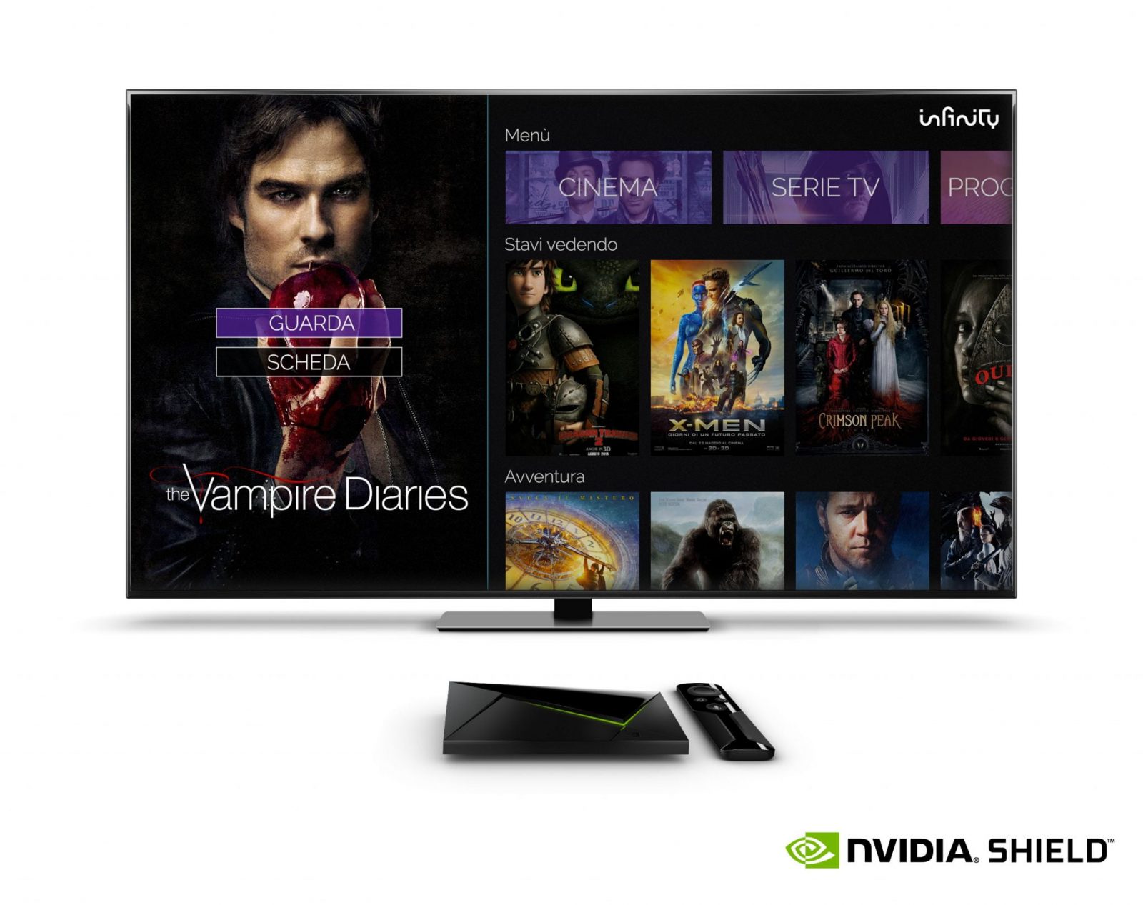 NVIDIA annuncia che SHIELD TV, il suo avanzaBssimo media player per lo streaming e l’intraIenimento in saloIo, è stato cerBficato come disposiBvo abilitato per Infinity, consentendo così di accedere al catalogo di oltre 6000 Btoli tra film, serie tv e cartoni animaB, anche in lingua originale e con soIoBtoli, messo a disposizione dal noto servizio di video on demand.