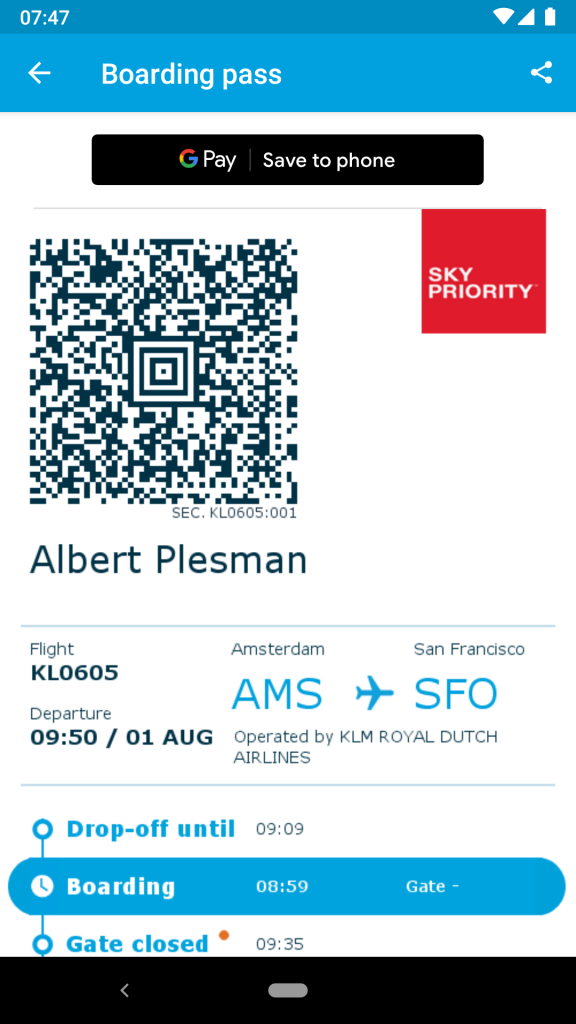 KLM si afferma, così, in prima linea nel suo cammino di continua evoluzione tecnologica essendo fra le prime compagnie aeree a offrire la possibilità di memorizzare la carta d’imbarco sul proprio smartphone tramite Google Pay.