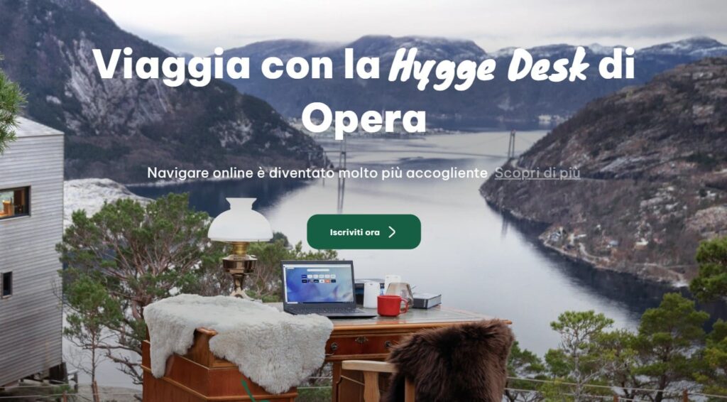 Opera, l’innovativa azienda norvegese sviluppatrice dell’omonimo browser web, ha recentemente lanciato un’iniziativa unica chiamata “Hygge Desk”. Questo progetto offre a dieci fortunati l’opportunità di trascorrere sei giorni lavorando da una scrivania “hygge” situata in alcune delle località più suggestive della Norvegia.