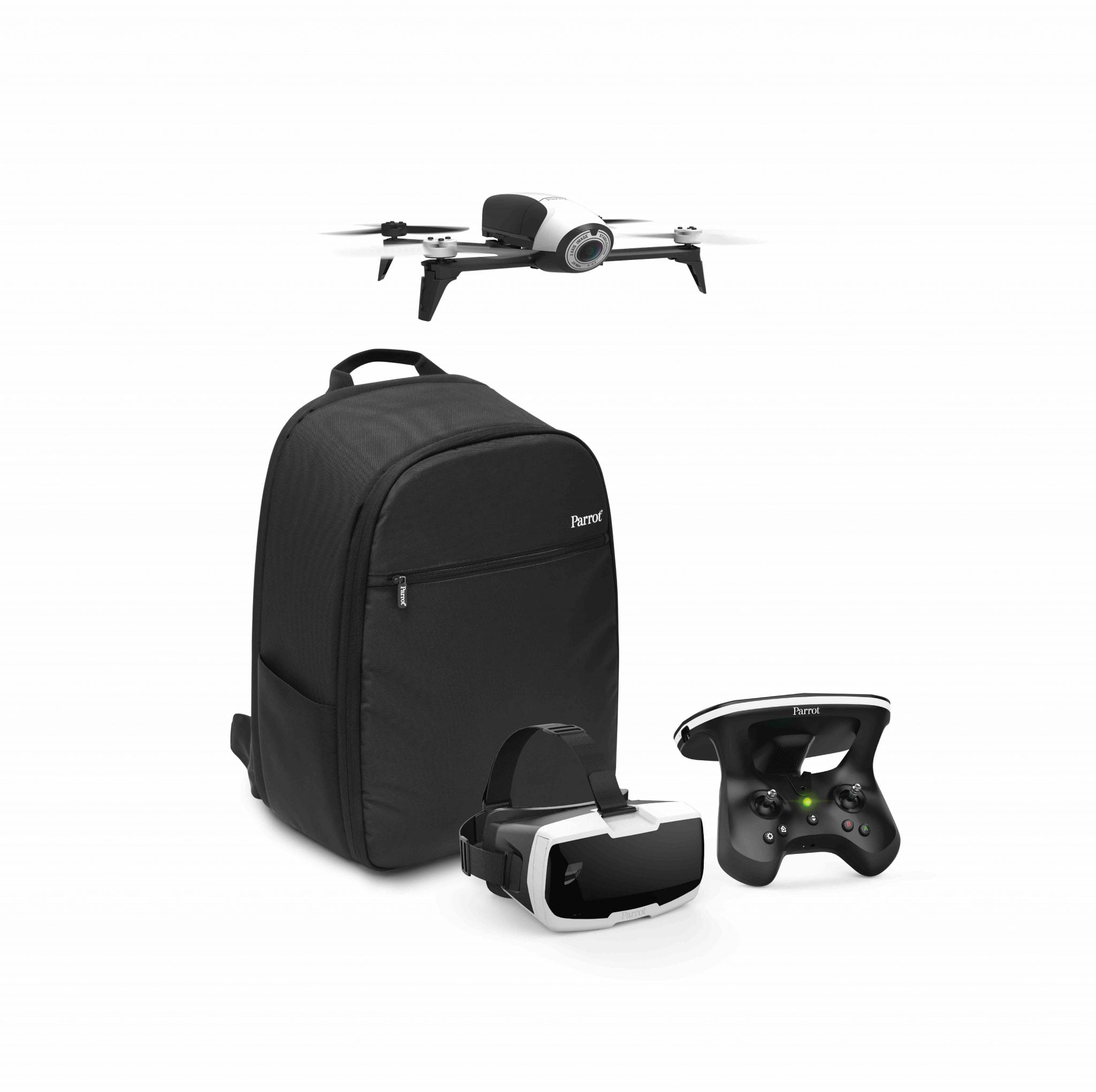 Il pack Parrot Bebop 2 Adventurer include: 1 Parrot Bebop 2, 1 Parrot Skycontroller 2, 1 visore FPV Parrot Cockpitglasses, 1 accesso free alla funzione in-app di visual tracking e GPS Parrot Follow Me, 1 zaino.
