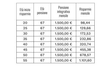 La tabella mostra che, se si inizia a risparmiare per la pensione a 20 anni, sarà necessario investire >meno di €100 al mese per tutta la durata della propria vita lavorativa per beneficiare a 67 anni di una discreta pensione integrativa. Se si iniziasse 10 anni dopo, a 30 anni, sarebbe necessario investire una somma ben maggiore (all’incirca €170); a maggior ragione, se si iniziasse a investire a 40 anni, la somma mensile quasi raddoppierebbe (€320). Come si può notare, quindi, più tardi si inizia a risparmiare per la propria pensione, maggiore sarà l’importo da dover investire mensilmente per raggiungere lo stesso risultato.