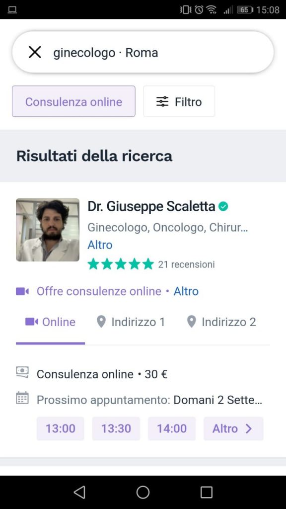 Attraverso la nuova app – disponibile gratuitamente sia su App Store che su Google Play – i pazienti, una volta effettuata la registrazione, in pochi e semplici passaggi potranno cercare lo specialista selezionando la categoria di riferimento, la prestazione ricercata, la patologia o semplicemente inserendo nome e cognome del professionista (con la possibilità di geolocalizzare la ricerca, qualora lo desiderino). Sarà possibile anche filtrare i propri risultati, usufruendo degli stessi filtri disponibili nella versione web, consultare il profilo completo dei medici, prenotare una visita e scrivere una recensione al termine della prestazione. Grazie alla funzione cronologia i pazienti avranno la possibilità di consultare lo storico delle proprie visite e quelle in programma e accedere alle informazioni e ai dettagli di ognuna. Infine, sarà possibile avviare una conversazione in tempo reale con lo specialista selezionato attraverso l’apposita chat o prenotare una consulenza online direttamente da casa.