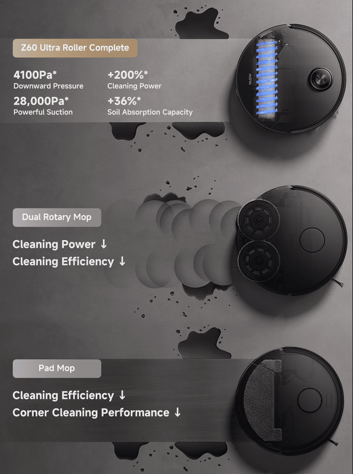 Z60 offre una potenza di aspirazione eccezionale a 28.000Pa, che lo colloca tra i robot aspirapolvere più potenti disponibili sul mercato, insieme alla spazzola TroboWave™ DuoBrush anti-groviglio di MOVA, che resiste all’aggrovigliamento dei capelli mentre rimuove lo sporco e i detriti dai pavimenti e dalle fessure.