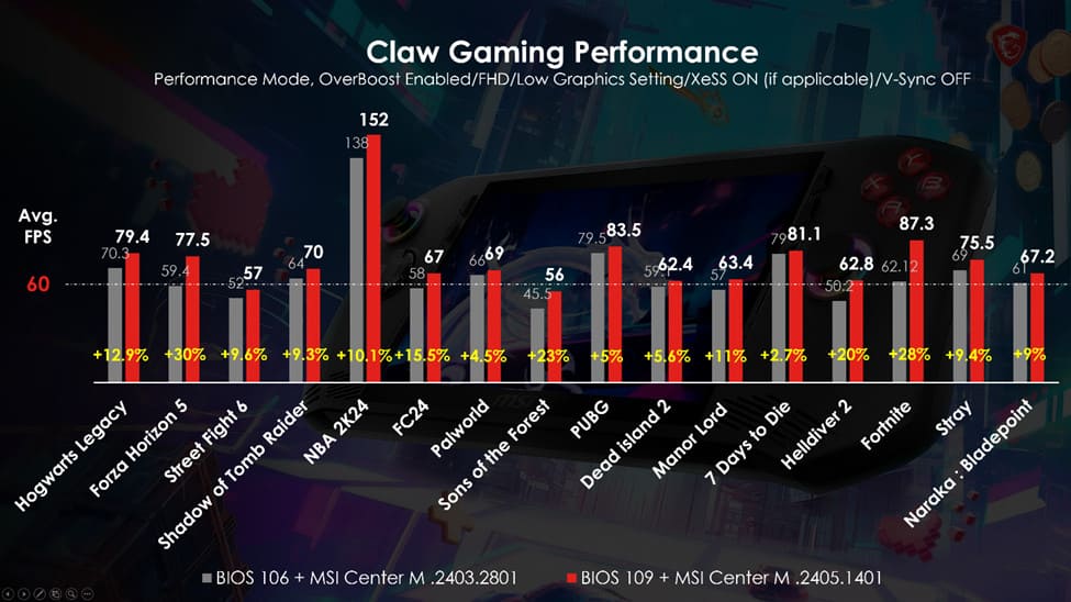 Le ultime versioni del BIOS E1T41IMS.109 (denominato 109) e di MSI Center M 1.0.2405.1401 (denominato 2405.1401) per Claw sono state testate internamente e hanno dimostrato di migliorare significativamente le prestazioni di gioco. Ad esempio, con il popolare titolo Forza Horizon 5 si è registrato un aumento delle performance fino al 30%. Anche altri giochi famosi come Fortnite e Helldivers 2 hanno registrato un aumento delle prestazioni di oltre il 20% con il nuovo BIOS e MSI Center M, offrendo un’esperienza di gioco ancora più fluida.