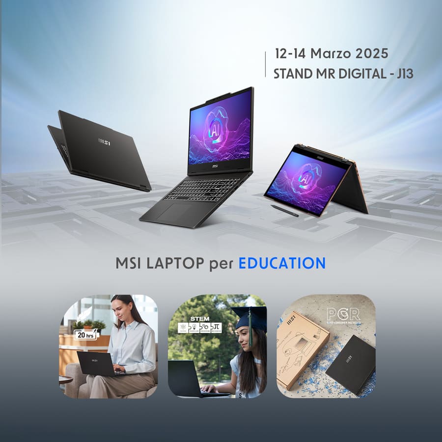 Grazie alla collaborazione con MR Digital, inoltre, MSI sarà presente a Didacta anche con uno spazio dedicato ai suoi laptop all’interno dell’area espositiva di uno dei principali operatori del settore (stand J13, Padiglione Spadolini, piano terra), dove si potranno toccare con mano i dispositivi portatili dell’azienda per il mondo Education e partecipare all’incontro “Rivoluziona l’Istruzione con MSI: Tecnologia, STEAM, Apprendimento Interattivo e Sostenibilità” che si terrà il 13 marzo alle 16:00. Grazie a questa collaborazione, inoltre, gli insegnanti che utilizzeranno la Carta del Docente per acquistare un laptop MSI Thin 15, Prestige 13 AI Evo oppure Modern 15 potranno accedere a una scontistica dedicata.