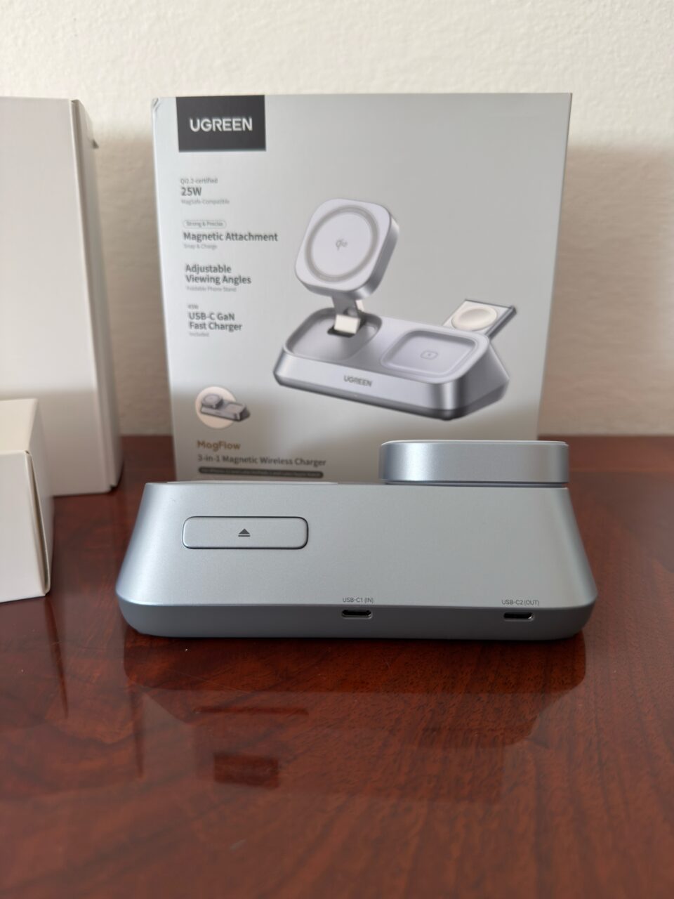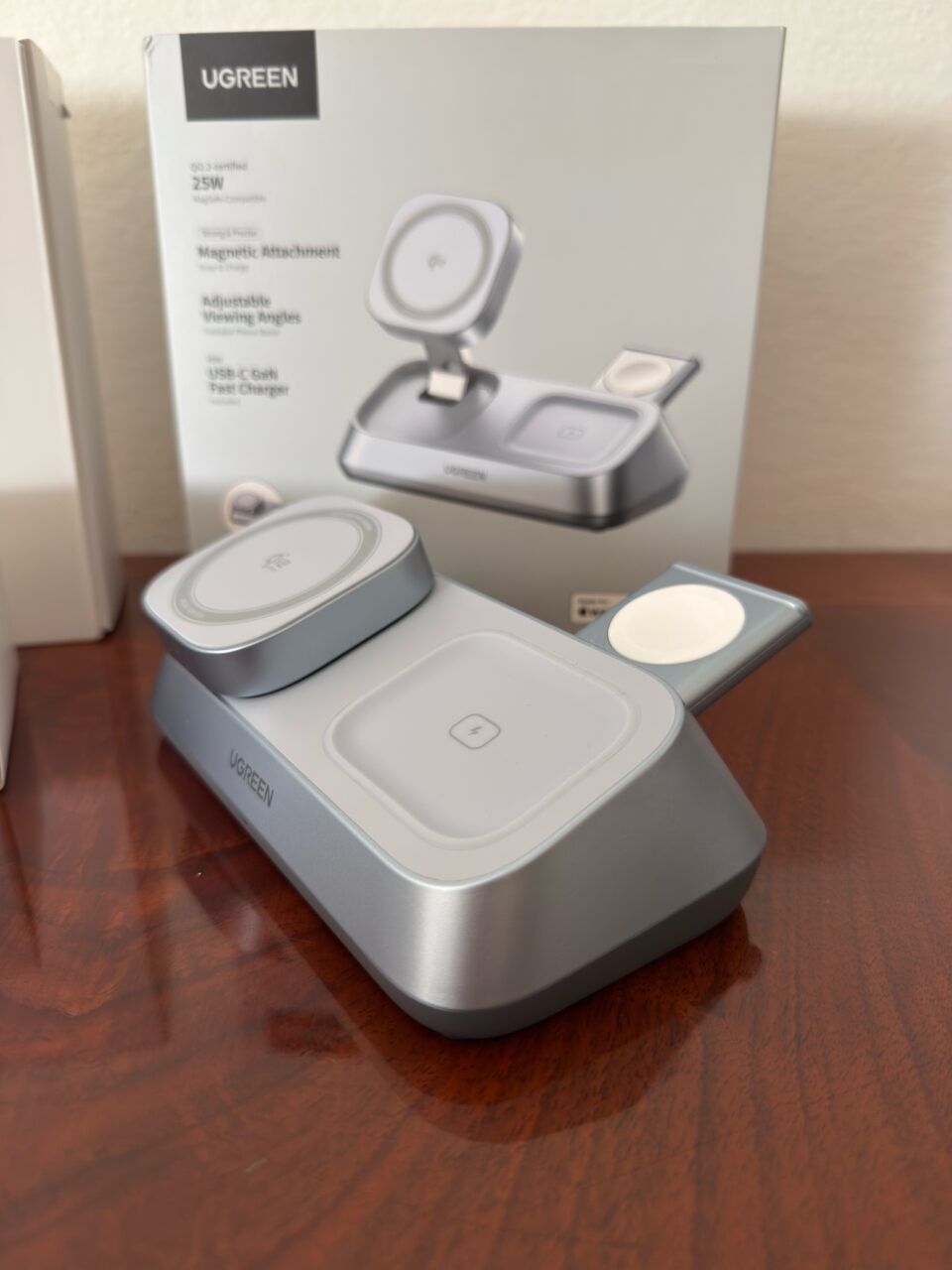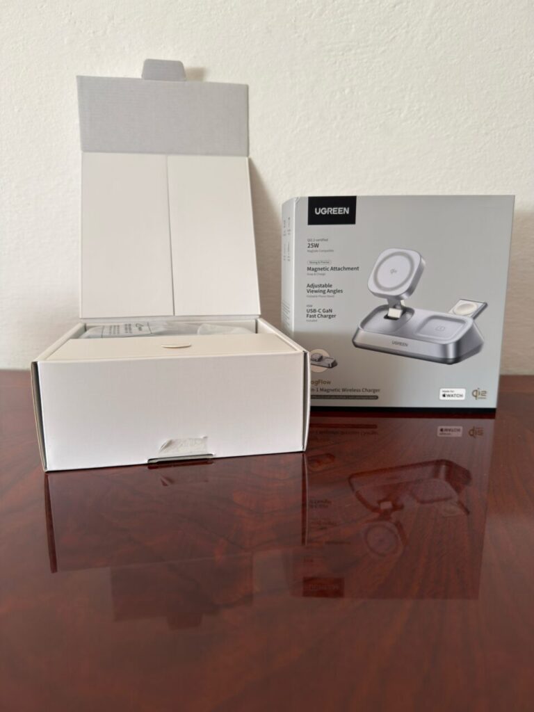 Supportando l’ultima tecnologia Qi2 la carica può arrivare fino a 25W (la potenza totale è di 35W) per lo smartphone, con una serie di magneti molti forti che terranno il tutto ben saldo, mentre la ricarica per AirPods e per Apple Watch è a 5W; ma se si pensa che tutto sia finito qui, ebbene sul resto è presente anche una porta USB-C aggiuntiva per ricaricare un altro propdotto. Piccolo appunto sul pad retrattile per caricare l’Apple Watch, che a me è piaciuto molto, con la possibilità di nasconderlo dentro alla base stessa e farlo uscire nel caso in cui avessimo da caricare il nostro Watch.