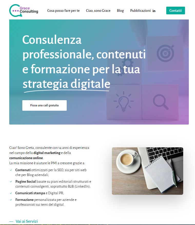 Un portale snello e un’offerta di servizi altrettanto focalizzata per Greta Lomaestro, professionista con esperienza ultradecennale nel digital marketing e nella comunicazione online, nonché autrice del manuale “Strategia digitale per le PMI”.