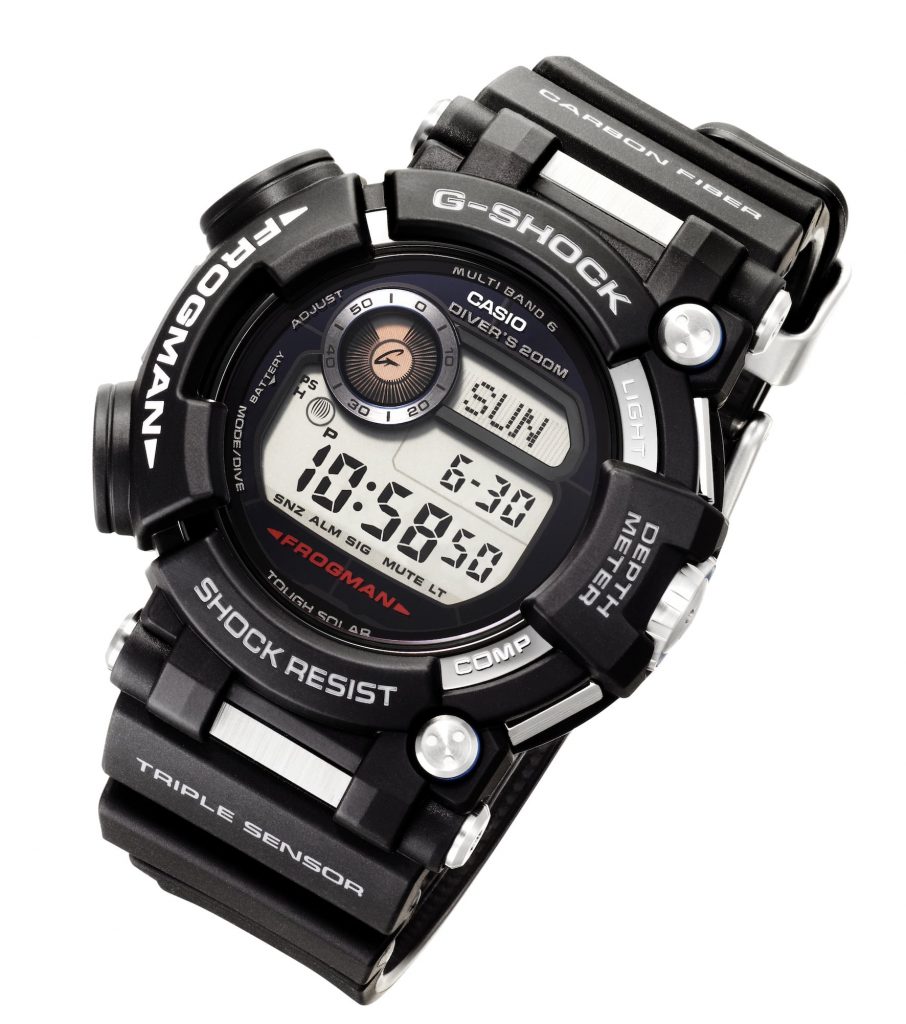 Gli orologi antiurto subacquei FROGMAN garantiscono una resistenza all’acqua fino a 200 metri certificata ISO e si caratterizzano per una forma asimmetrica unica nel suo genere e in grado di consentire la massima libertà di movimento al polso. Dopo il 1993, anno di nascita del primo modello FROGMAN DW-6300, Casio introduce nel 1995 il DW-8200, composto da materiali in titanio resistenti alla ruggine, cui fa seguito il DW-9900 (1999) con il suo form factor dalle dimensioni ridotte. Nel 2001 l’azienda lancia il GW-200 a ricarica solare e, infine, il GWF-1000 nel 2009, orologio in grado di ricevere segnali radio per la calibrazione dell’ora da sei stazioni di trasmissione dislocate in tutto il mondo. I modelli di orologi FROGMAN hanno continuato la propria evoluzione con la costante integrazione di tecnologie allo stato dell’arte.