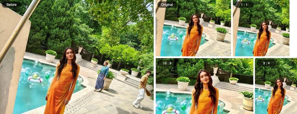 Addestrata su dati di fotografia professionale5, Ricomposizione AI regola automaticamente proporzioni, ritagli e distorsioni, applicando anche dei filtri permettendo agli utenti di scegliere tra diverse opzioni e generare il risultato con un solo clic.