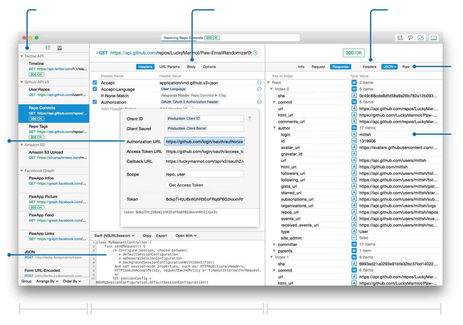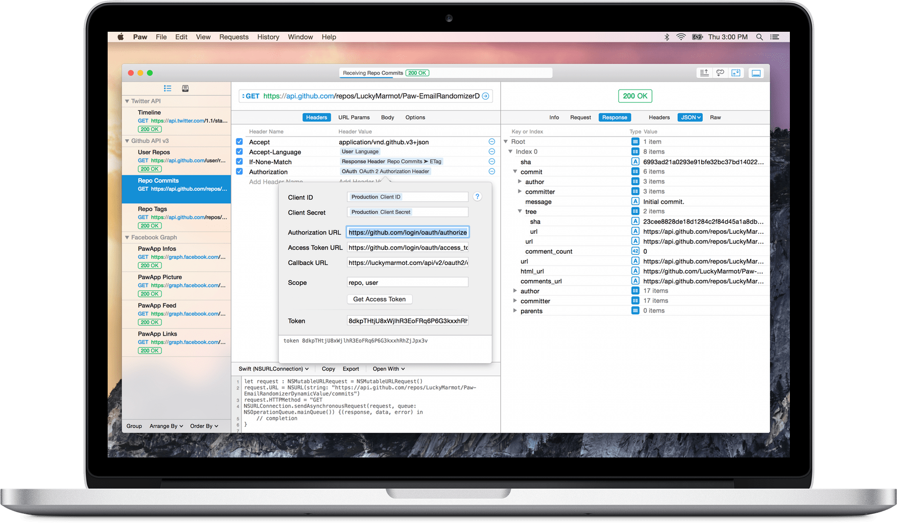 Paw nato dalla Paw Inc. è un ottimo strumenti per gli sviluppatori, è un’applicazione per Mac completa e ben progettata che rende l’interazione con servizi REST delizioso. O sei un creatore di API o un consumatore, Paw ti aiuta a costruire le richieste HTTP, controllare la risposta del server e anche generare il codice client.