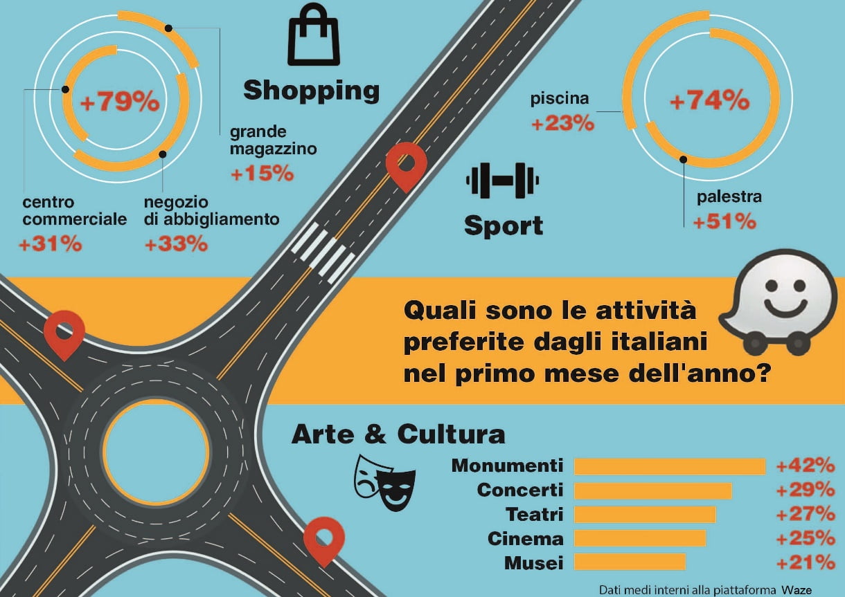 Nell’istantanea dei dati raccolti da Waze, spiccano sport e shopping seguiti da cultura e intrattenimento