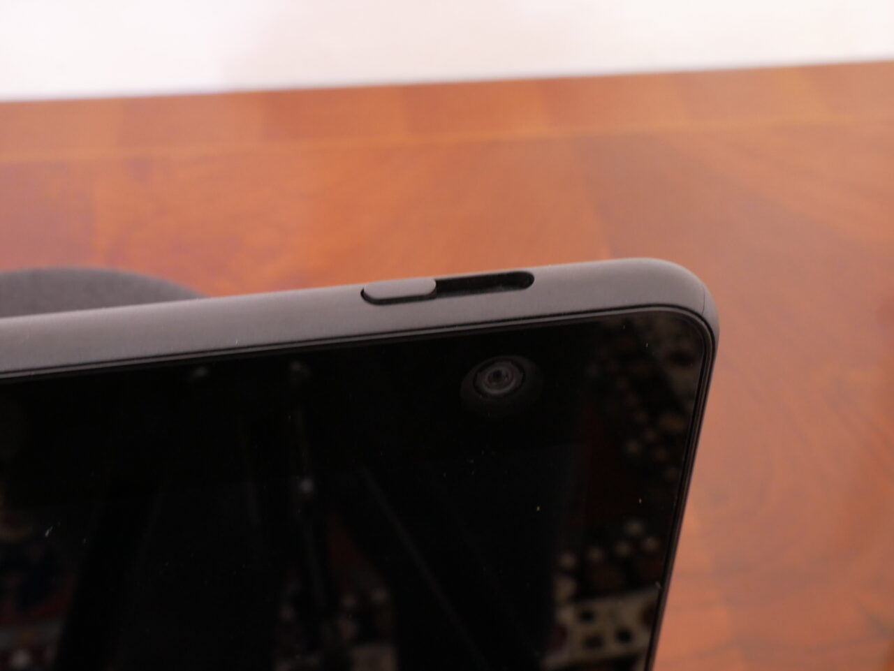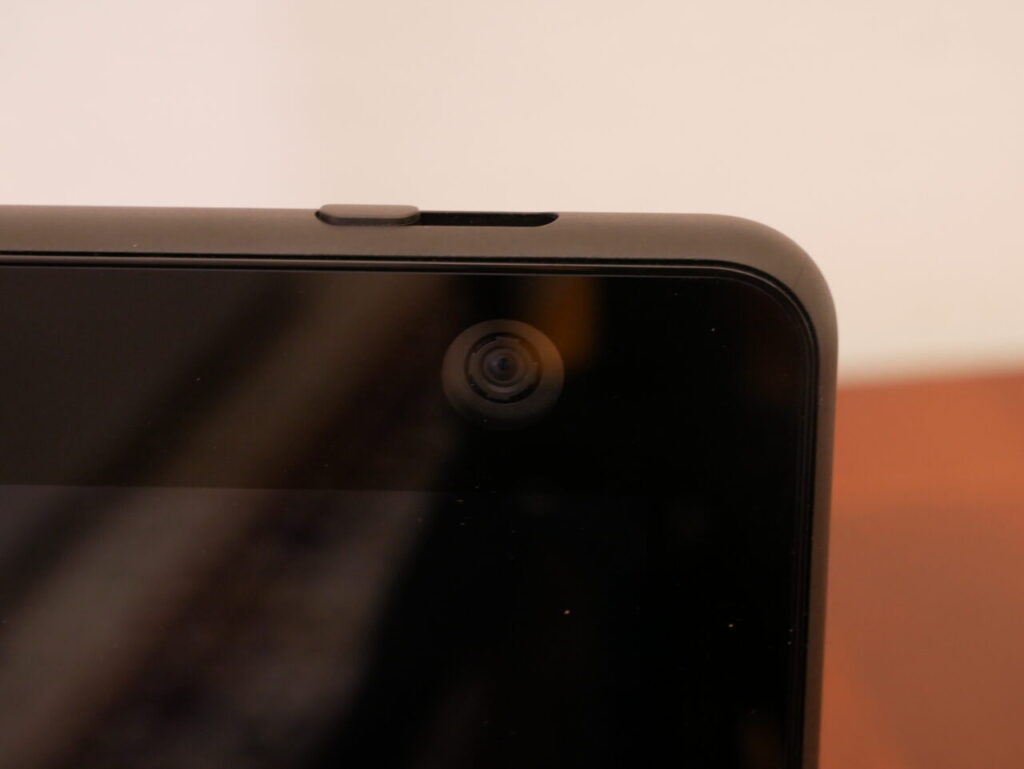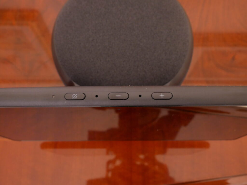 Il display sembra ragionevolmente luminoso però anche riflettente, in questo caso può un problema se si dispone di luci dall’alto e lo schermo è inclinato all’indietro. La risoluzione è bassa rispetto a dei tablet che posseggono le medesime dimensioni, ma visto che la tipica distanza da cui si guaderà non è cosi lontana, risulta essere nitido e facile da leggere. Nella parte superiore, come troviamo anche per gli altri Echo con display, possiede il pulsante per disattivare la fotocamera chiudendo l’otturatore con un tasto fisico oppure è possibile con il pulsante microfono/fotocamera che disattiva il microfono e disabilita elettronicamente la fotocamera; inoltre troviamo i consueti pulsanti di aumento/riduzione del volume.