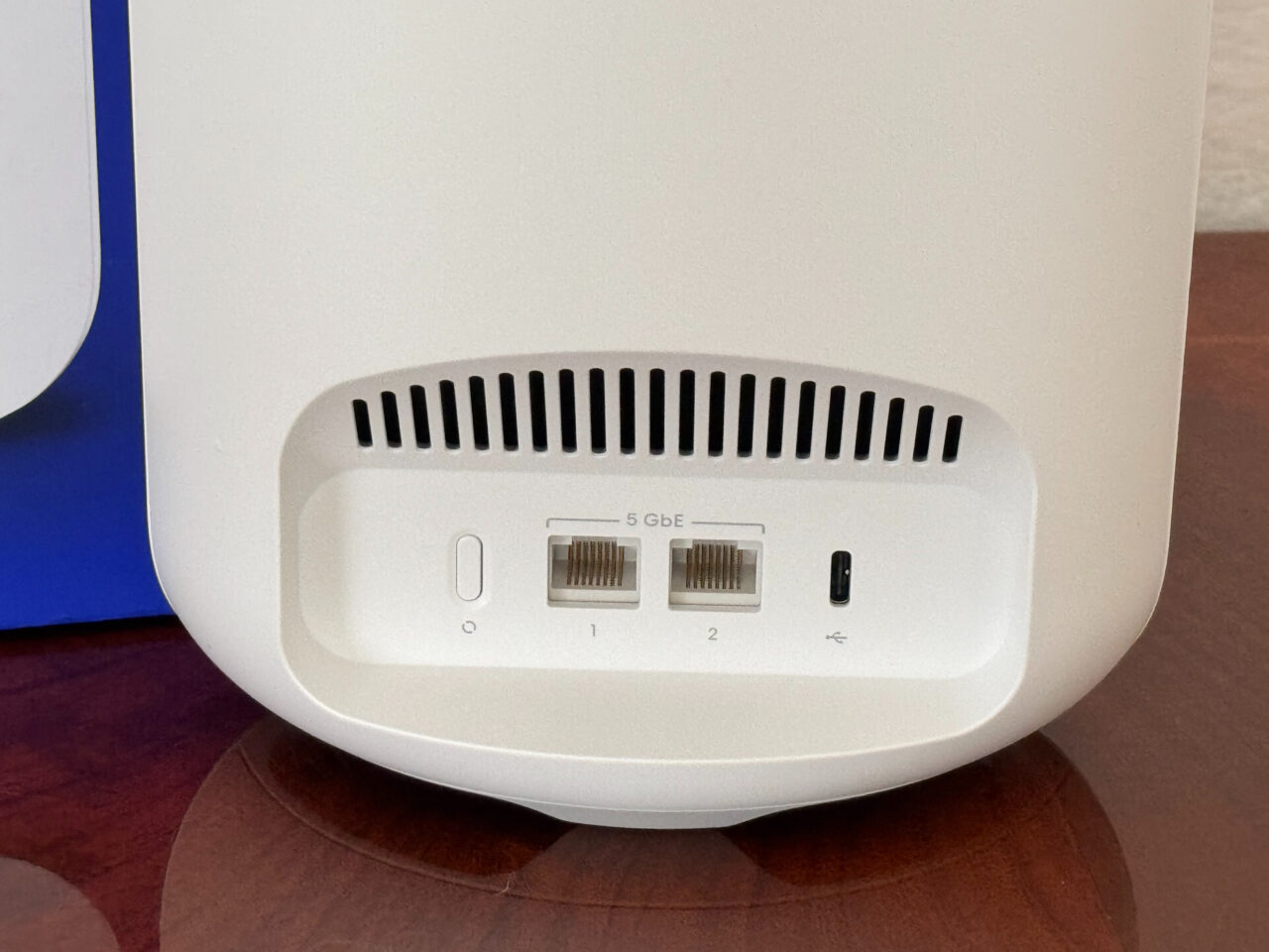 Nel nostro caso abbiamo provato l’unità singola ma come per gli altri eero è possibile connettere uno o più nodi della rete mesh, e ogni nodo è dotato didue porte (nessuna PoE ed avrei preferito fossero almeno 3 visto che di due solo una rimane libera, il modello Max invece ne possiede 4) 5 GbE (e velocità wireless fino a 3,9 Gbps), per una copertura fino a 190 metri quadrati. Sempre nella parte posteriore troviamo il foro di alimentazione ed il tasto del reset.