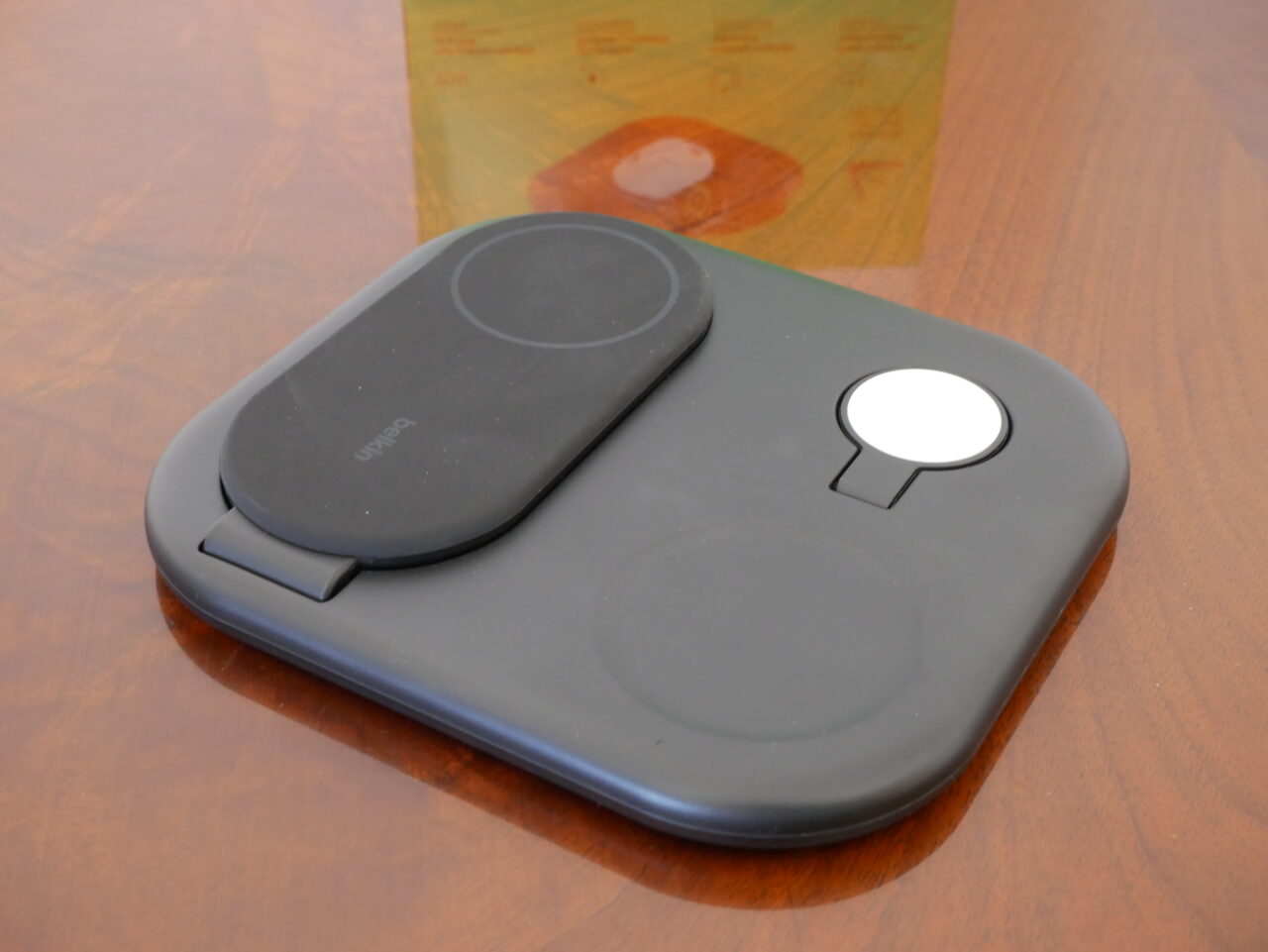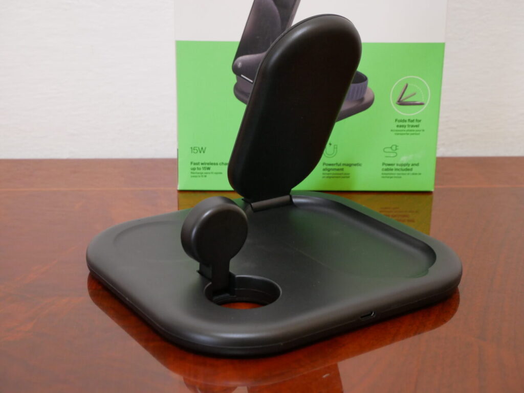 Se da una parte la base per caricare gli AirPods è come al solito “piatta”, questo non si può dire per quella per Apple Watch ed iPhone; infatti entrambe possono essere regolate per ricaricare tali dispositivi in verticale, potendo sfruttare la modalità night stand di Apple Watch e standby dell’iPhone (ovviamente può essere caricato sia landscape che portrait, si può regolare l’angolo di visione, fino a 90 gradi, in base alle proprie esigenze). Grazie a tale design pieghevole il caricatore può essere portato ovunque dentro una borsa o uno zaino.