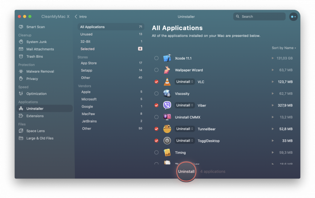 Eliminare una app in maniera non corretta comporta file sparsi in giro non facili da ritrovare per cui sempre utile eseguire una disinstallazione precisa. Da questo punto di vista è davvero ben fatta e organizzata, fornendo un elenco completo delle applicazioni installate suddivisa per fornitori, fonti di installazione (App Store, Setapp e altre), e categorizza le applicazioni in “non utilizzate, “avanzi” (componenti residui dalla disinstallazione precedente di app), oltre a fornire un quadro delle vecchie app a 32 bit ancora presenti.