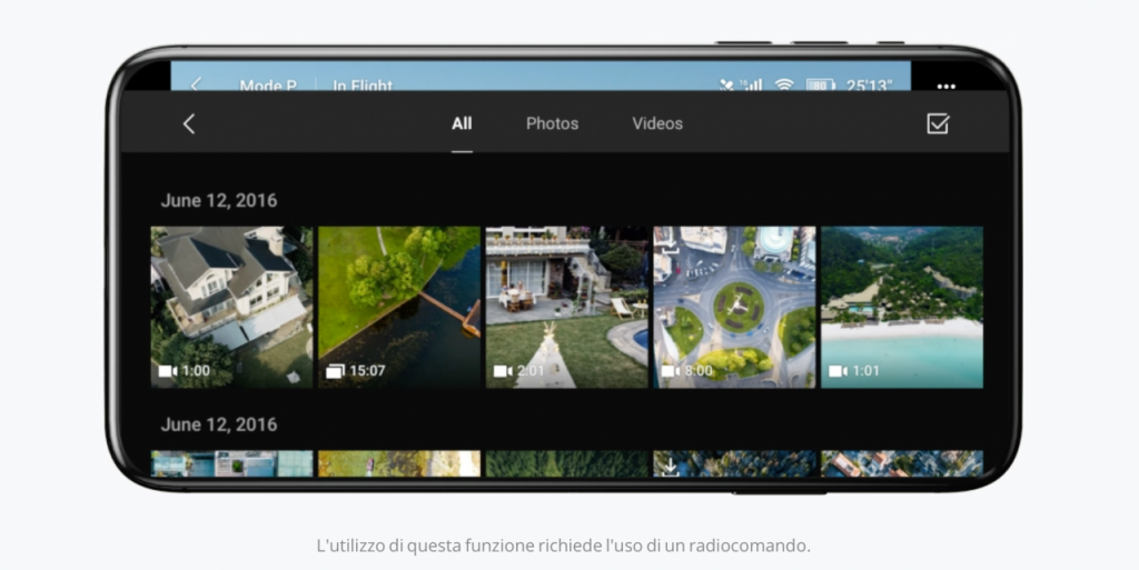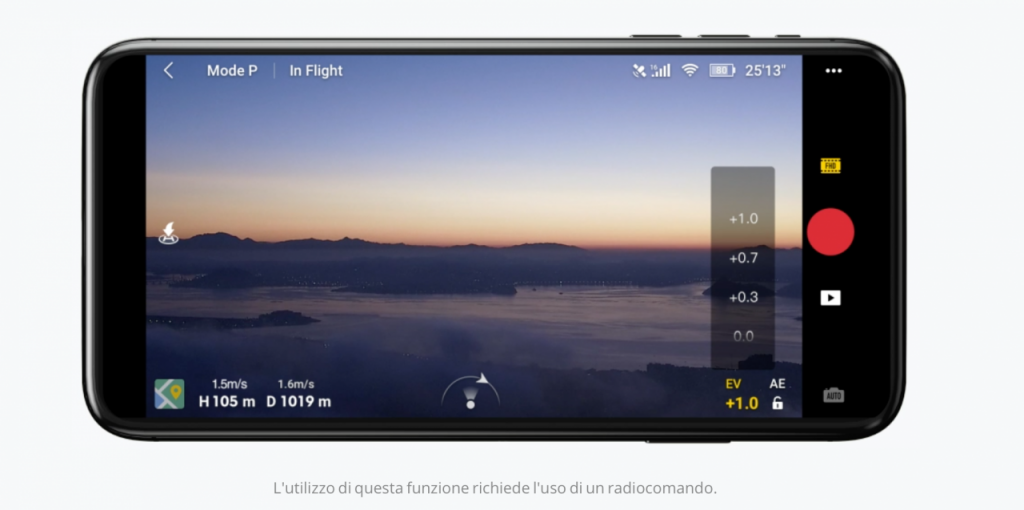 Spiccato il volo troviamo il Mini 2 ben stabile e fermo, questo grazia hai sensori posizionati sotto la pancia che permettono di stazionare anche in ambienti chiusi senza ricevere segnali dai satelliti (riceve segnali dai sistemi GPS, Glonass e GALILEO); tutto pronto per i nostri comandi.