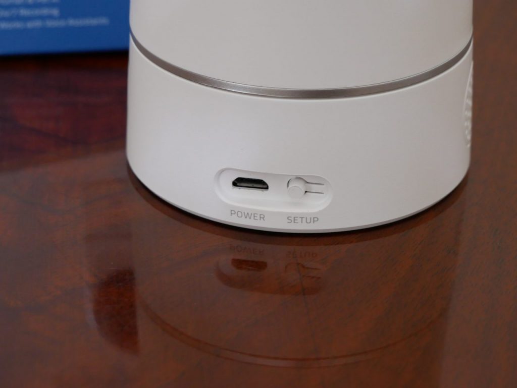 Sempre nella base troviamo anche gli altoparlanti riposti sul lato sinistro e destro, nella parte anteriore invece abbiamo un LED di stato che lampeggia in blu durante la configurazione, blu fisso quando la videocamera è collegata e funziona correttamente. Sul retro della base troviamo la porta di alimentazione micro USB (peccato mi sarei aspettato la type C) ed il pulsante di sincronizzazione.