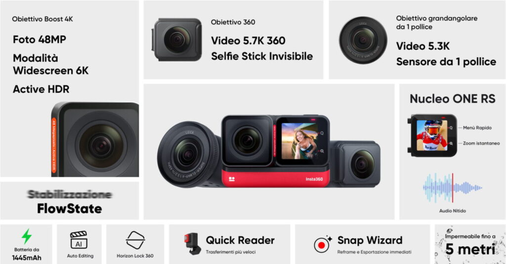 Nello store Insta360 troveremo una gran quantità accessori per la nuova One RS direttamente a questo link.