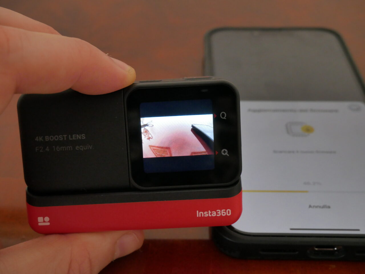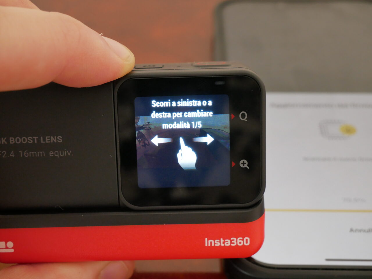 Prima ancora di utilizzare l’applicazione per smartphone, sarà possibile gestire la Insta360 One RS anche con il piccolo schermo posteriore; gestendolo con varie gesture con le quali dovrete prendere dimestichezza.