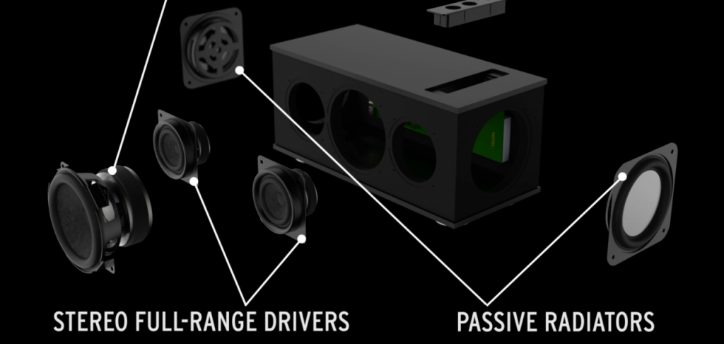 The One II presenta una griglia avvolgente di ispirazione retrò. Leggermente più piccolo di The Three, One II utilizza gli stessi altoparlanti primari, una coppia di driver “full range” da 2,25 pollici, ma li unisce con un woofer da 4,5 pollici più piccolo e radiatori passivi più piccoli (uno su entrambe le estremità).