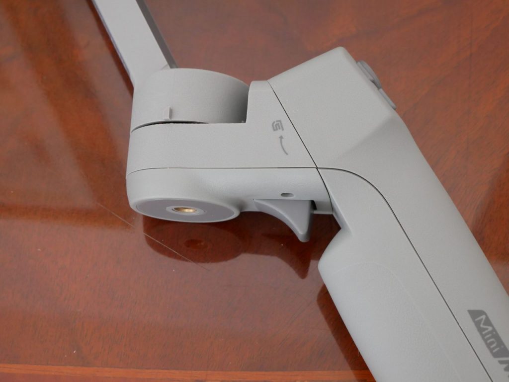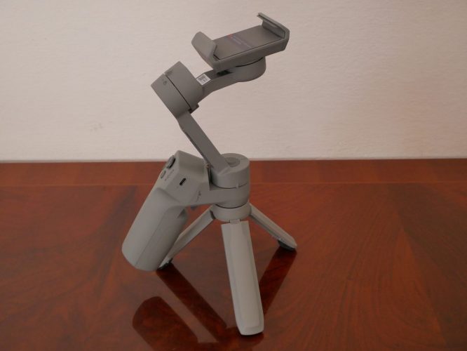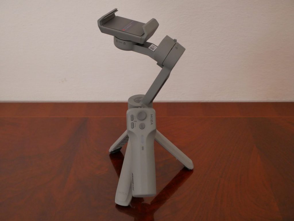 Caratteristica unica che lo differenza da altri gimbal è l’inserimento del mini treppiede non più essere fissato alla parte inferiore dell’impugnatura ma solo alla base del braccio principale. Questo gli concede il vantaggio di una presa a due mani ma prevede un’altezza della telecamera ridotta per un POV più ampio.