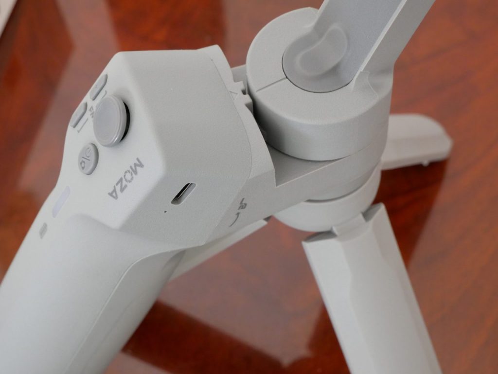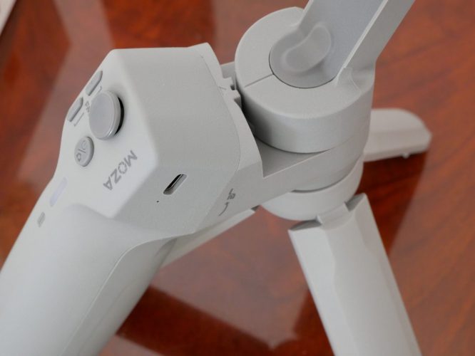 Il vantaggio di Moza Mini MX è, oltre alla leggerezza, che si piega su stesso, con un peso inferiore a un chilo, risultando facile da trasportare. Nel complesso il gimbal sembra avere una buona distribuzione del peso; insieme al treppiede in dotazione è possibile ottenere una presa migliore con due mani.