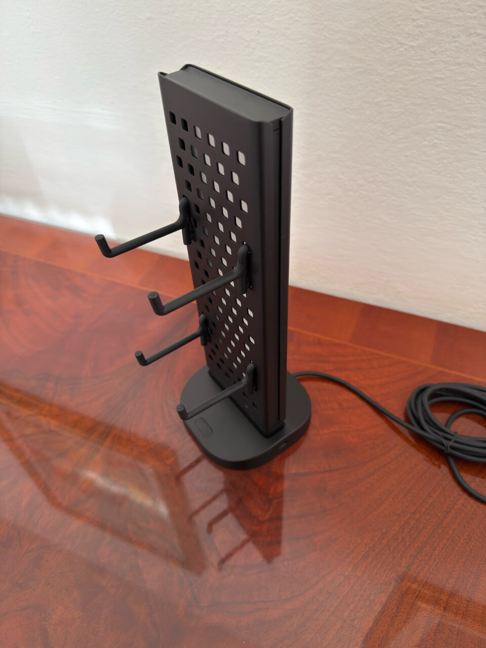 È ideale per collegare cuffie, microfoni, tastiere, mouse o piccoli dispositivi, contribuendo a mantenere il setup più ordinato. Il pannello perforato include ganci modulari che permettono di appendere controller, cuffie o altri accessori leggeri. Questa soluzione sfrutta lo spazio verticale e libera superficie sulla scrivania, migliorando sia l’ordine che l’ergonomia.