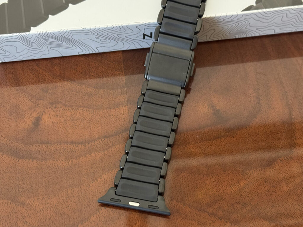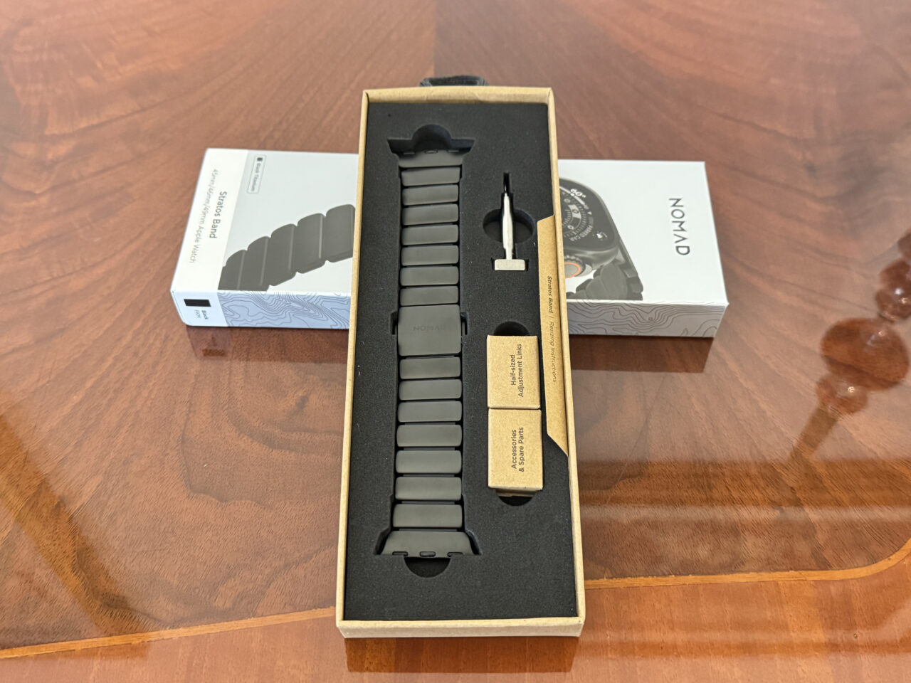 A differenza del cinturino a maglie Apple, quello Nomad possiede ancora il classico strumento, incluso in confezione, per poter regolare le maglie. Rispetto agli altri cinturini di Nomad, questi collegamenti sono molto più facili da rimuovere, i perni sono caricati a molla. Per cambiare le maglie si effettua lo stesso meccanismo così come le maglie dei cinturini degli orologi classici.