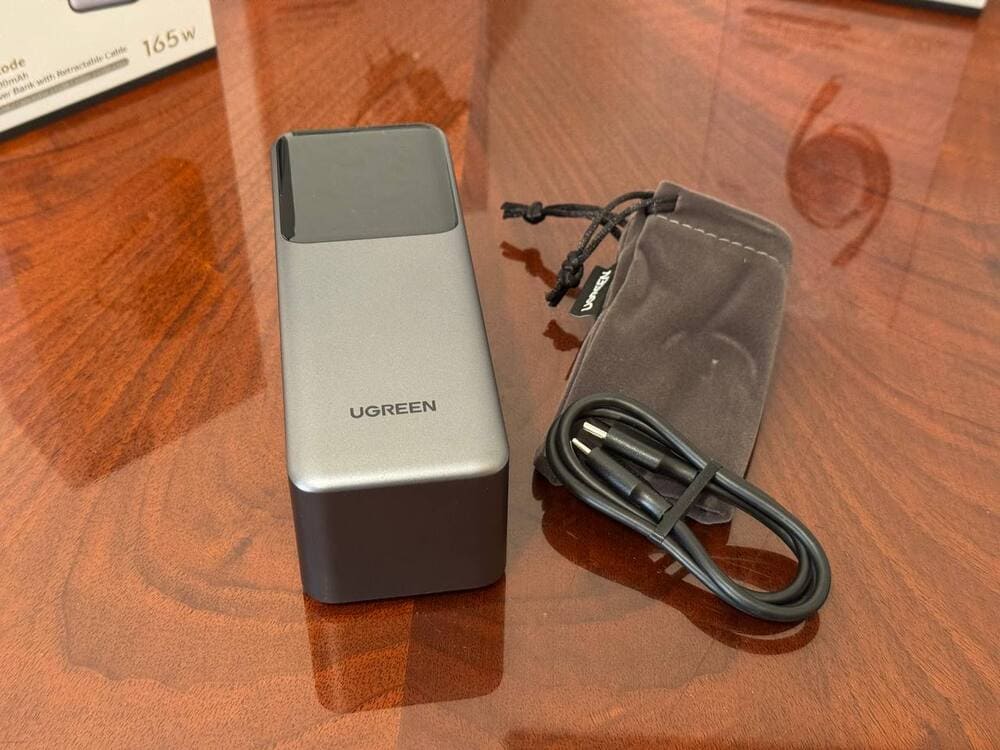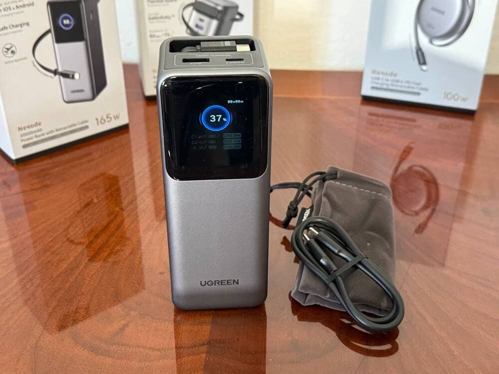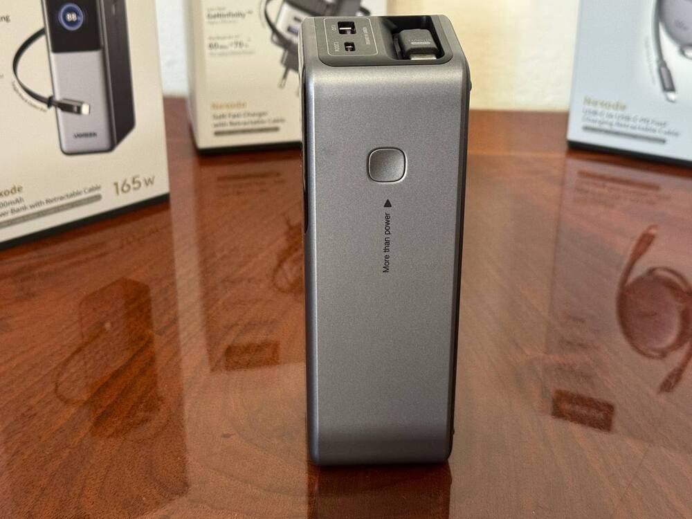 Ad esso si aggiunga anche una porta USB-A per ricaricare i dispositivi, ed una seconda USB-C che può caricare i dispositivi che il power bank stesso. A livello di potenza siamo a 100 watt su ciascuna delle porte USB-C, con una potenza massima complessiva erogabile di 165 watt. La ricarica invece del power bank stesso arriva a 100 watt, in poco meno di due ore lo avremo carico.
