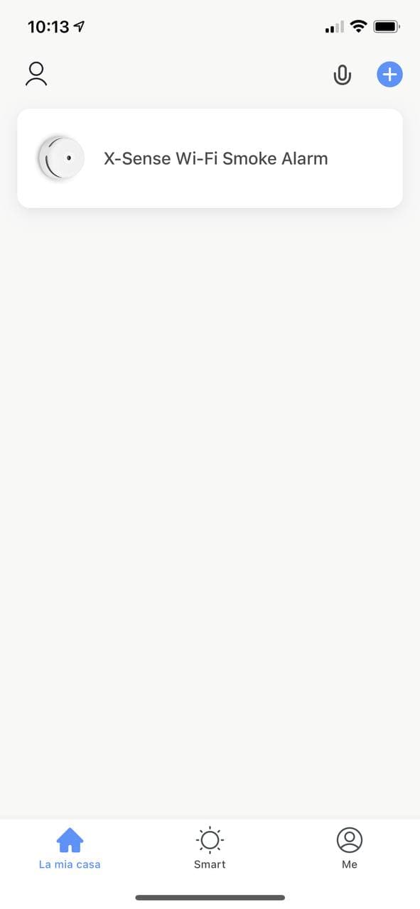 Una volta aperta, l’app si presenta con una cifra stilistica molto sobria, infatti nella parte alta troviamo, da sinistra, la possibilità di verificare le info riguardanti il nostro account, la possibilità di dare un comando vocale ai sensori (non in questo caso) e di aggiungere altri dispositivi.