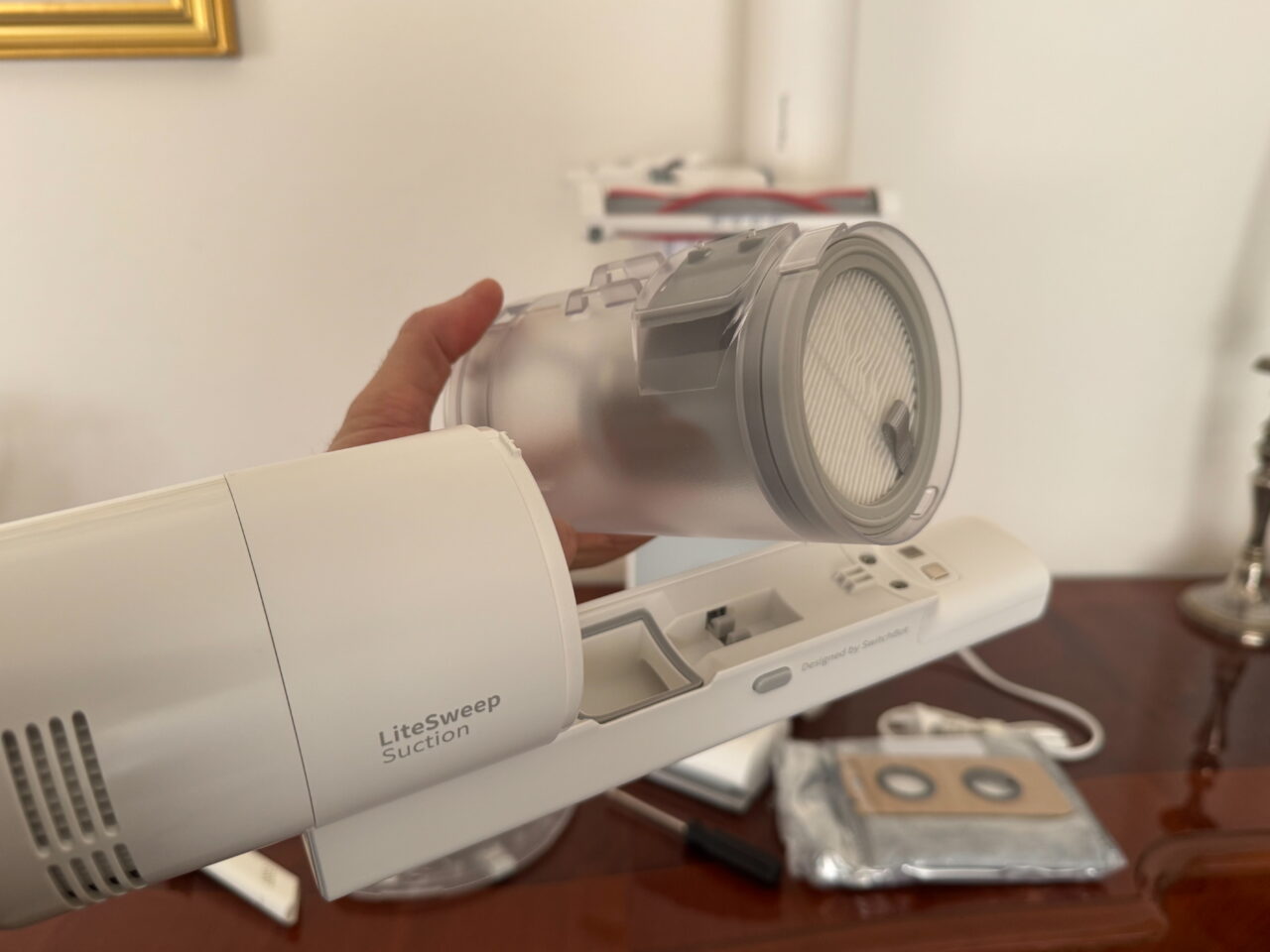 Quando lo inseriremo nello stand che è annesso alla base in automatico si svuoterà ma possiamo farlo anche premendo il pulsante presente in bella vista sullo stand, oltre a ricaricare l’aspirapolvere; che possiede una batteria estraibile sul manico (ottima cosa per sostituire la batteria solamente senza comprare il prodotto completamente).