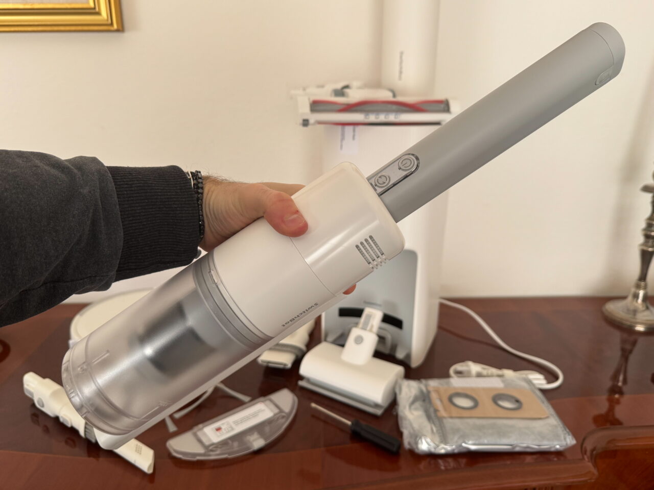 L’aspirapolvere manuale è davvero performante, vanta una potenza di 20.000 Pa alla massima intensità e un sistema di filtraggio a 5 livelli, catturando il 99,5% delle particelle da 0,3 um per un’aria priva di allergeni. Ha un serbatoio da 300 ml e una batteria da 2.200 mAh, che si ricarica completamente in circa 3 ore, garantendo fino a 15 minuti di autonomia, 37 minuti in modalità silenziosa.